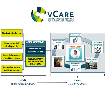 vCare monitors the patients’ daily activities, conditions, and habits to provide personalised feedback to recover the Quality of Life thanks to coaching programmes initialised by specialists in a well-elaborated clinical pathway as a tailored rehabilitation plan.