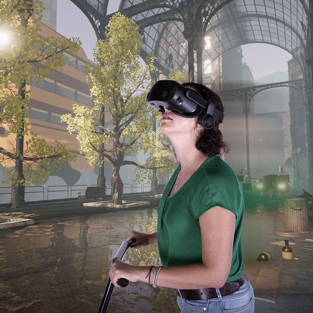 With our system, the user can walk and navigate in a safe and free haptic way through 3D VR worlds. By means of a steering wheel, full navigation is possible whilst the steering wheel also provides stability for the user.